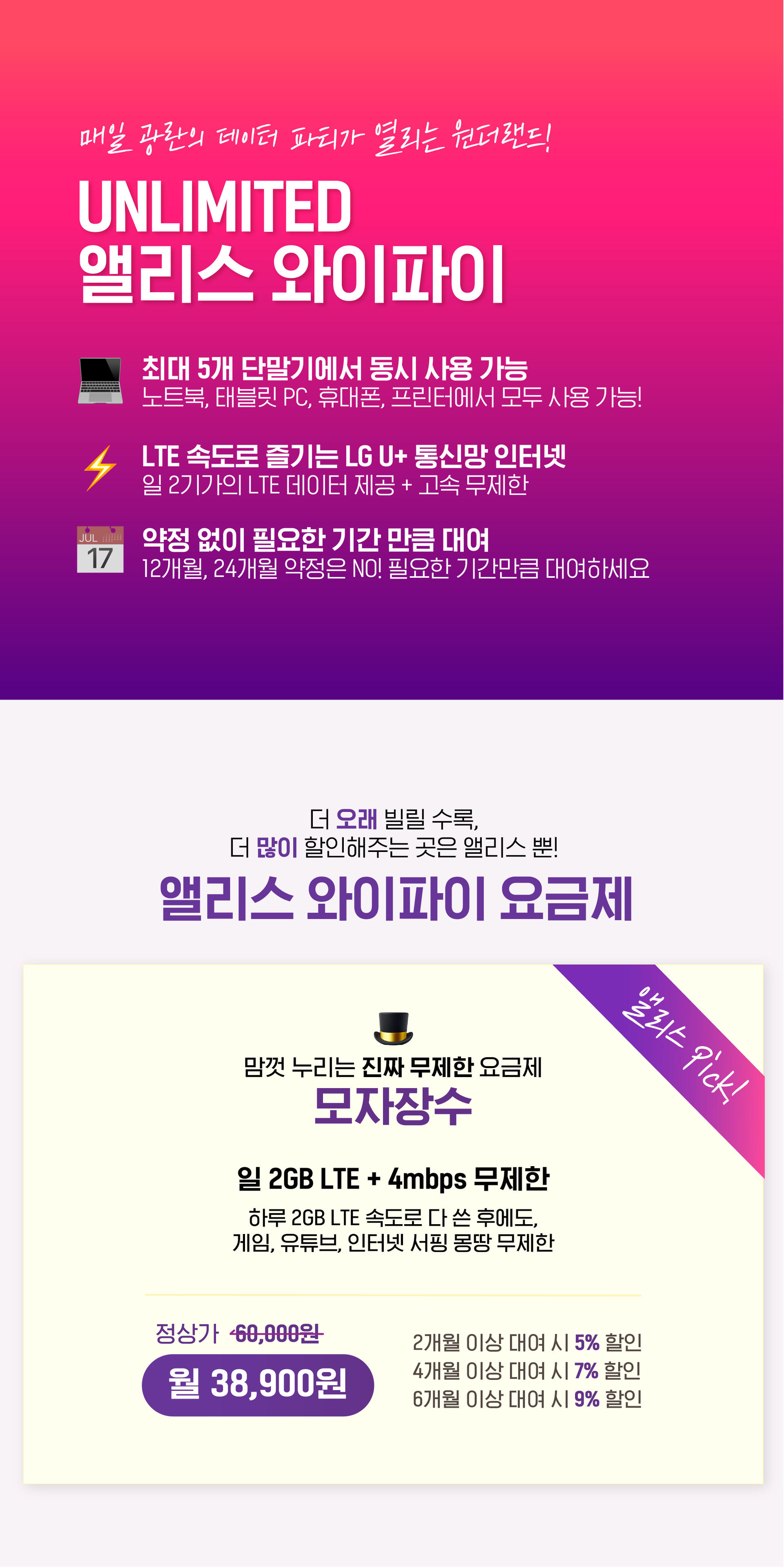 3. 만사가 귀찮으시면 고객센터로 전화 (02-336-4183) 또는 카카오톡 (alicewifi)으로 연락주세요. 친절한 앨리스가 상담해드립니다.